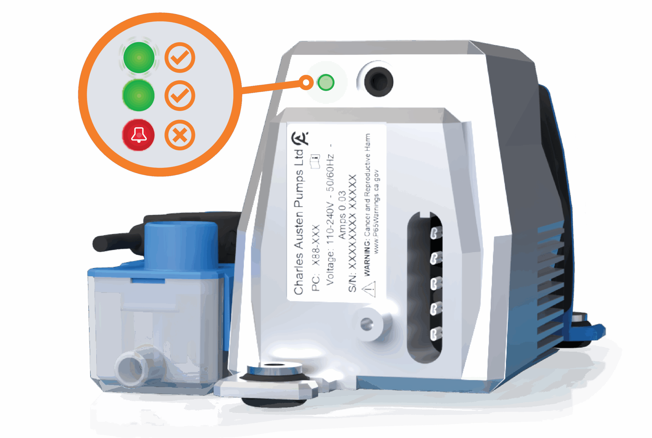 The system follows a clear three-stage sequence: solid green for normal operation; flashing green while the pump removes condensate and flashing red with audio alert for faults. Even during errors, the pump continues running, maintaining reliability and performance.