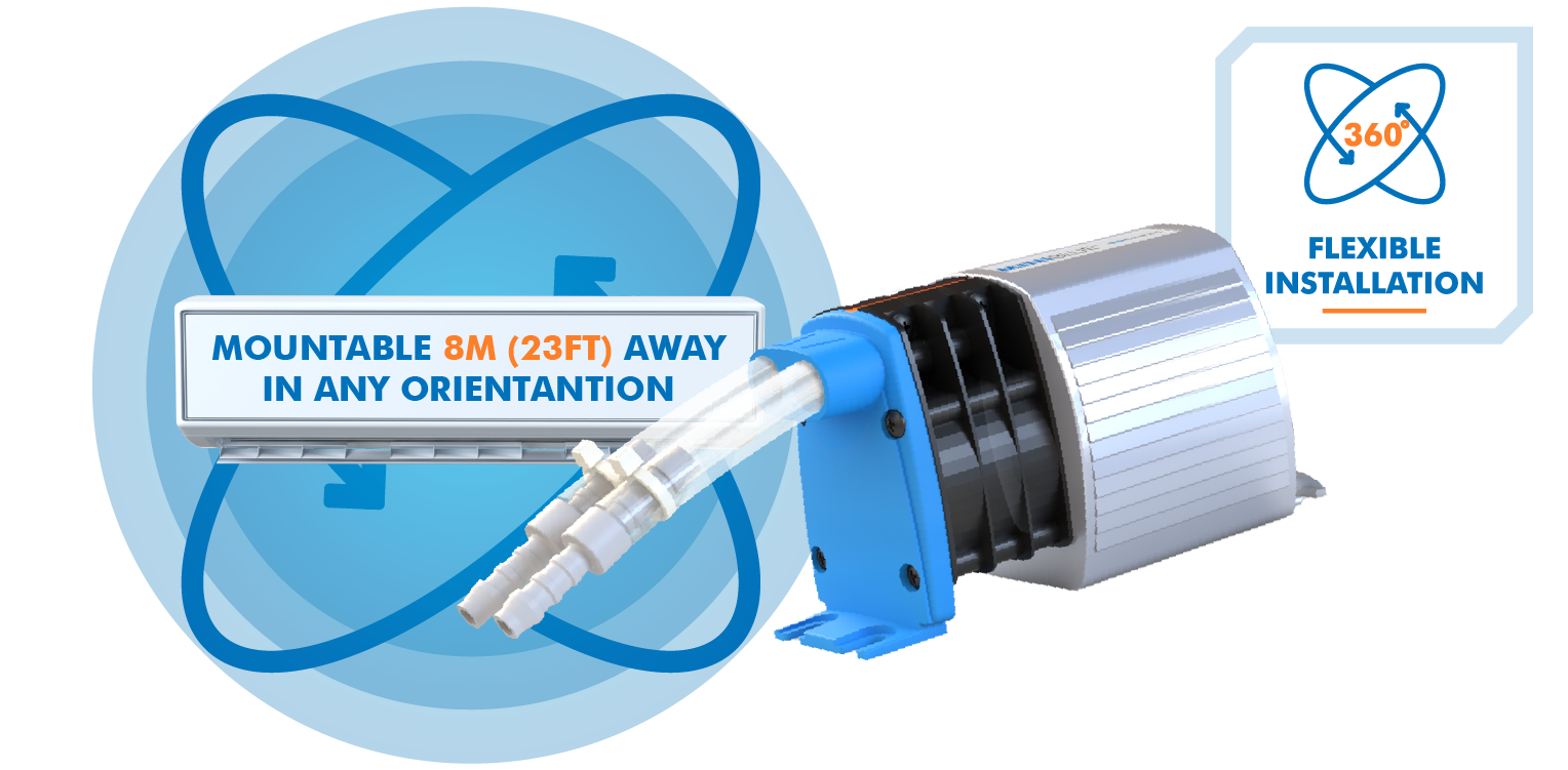 The MegaBlue pump offers flexible installation with the ability to be mounted in any orientation without affecting performance (8m/ 23ft away from the unit). Its forward facing spouts and versatile mounting options allow for seamless integration into tight spaces or unconventional setups, ensuring reliable operation across a wide range of HVAC applications.