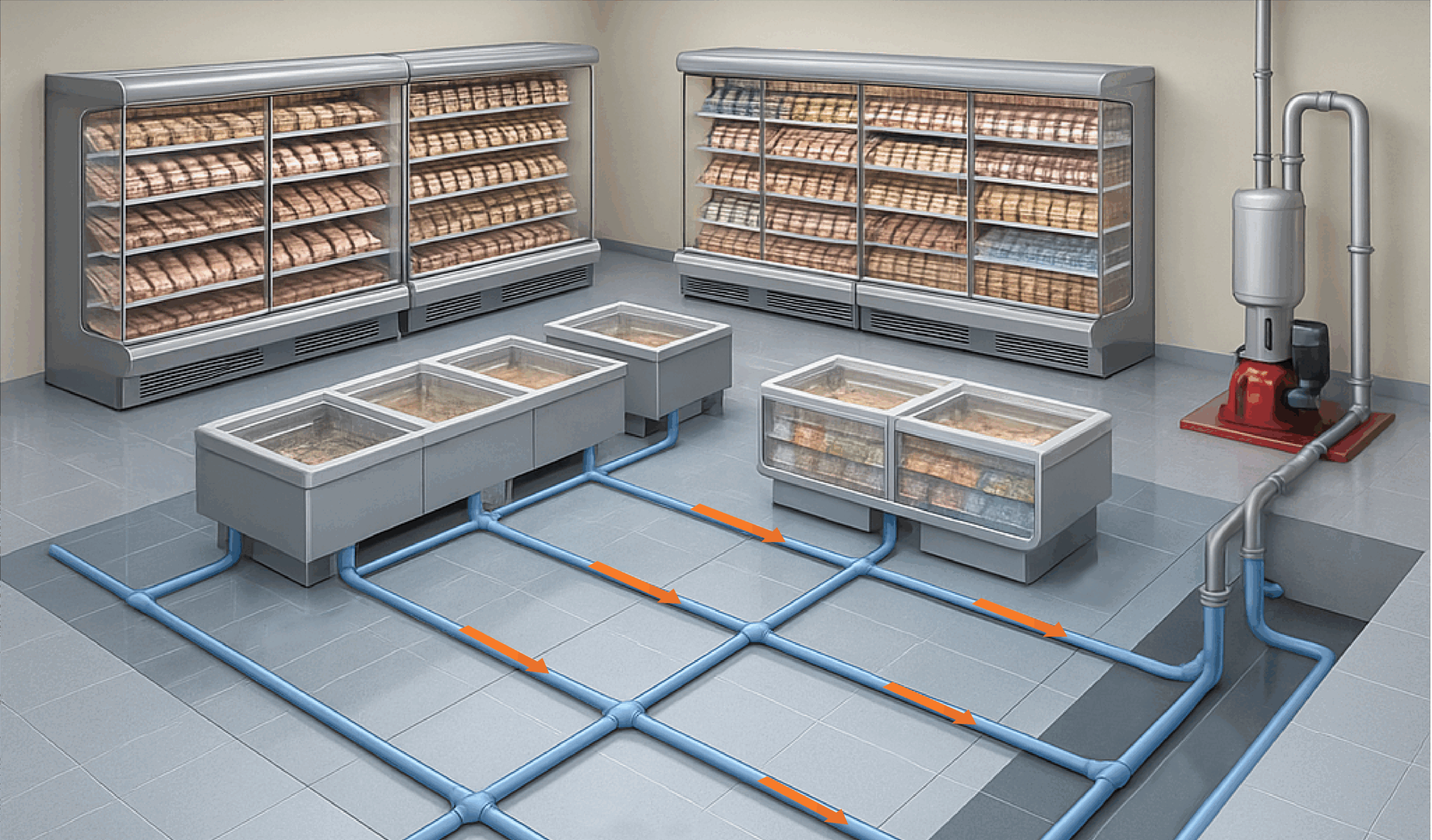 While central vacuum systems offer flexibility in design and efficient condensate removal, they are also costly to operate and maintain. These systems use a industial scale vacuum pumping system to extract condensate. Although they provide a more effective solution than traditional evaporator pans, their reliance on a single integrated system poses a significant risk. If one component fails, the entire system can shut down, leaving no backup, resulting in total refrigeration failure across a store.